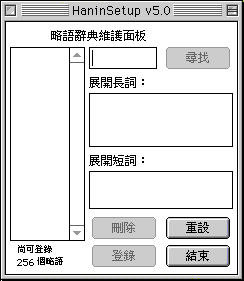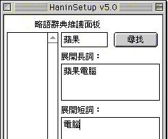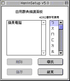 建立和使用專業辭典、自用辭典和略語辭典在“漢音輸入法”清單中選取“漢音設定”,輸入法便會顯示 HaninSetup v5.0 控制面板;您亦可利用對應的快速鍵指令,在鍵盤上按 Option-Shift-S 鍵,顯示 HaninSetup v5.0 控制面板(亦可從現用系統的“控制面板”檔案夾按兩下 HaninSetup v5.0 控制面板,顯示 HaninSetup v5.0 控制面板。)
