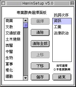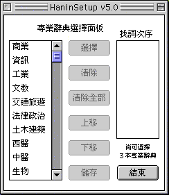 Hanin 5.0.1 提供了 14 種專業辭典,它們已隨系統安裝程式安裝到您的系統中。您可以選擇不同的專業辭典,獲得各種詞組組合。 在專業辭典選擇面板的左邊列出了系統中所有的 Hanin 專業辭典。在任何一種辭典上按一下,按“選擇”按鈕,所選擇的辭典將移到右邊的“找詞次序”框。 您可以選擇多個辭典,並用“上移”和“下移”按鈕選擇搜索辭典的次序,辭典位置越靠上,優先權越高。